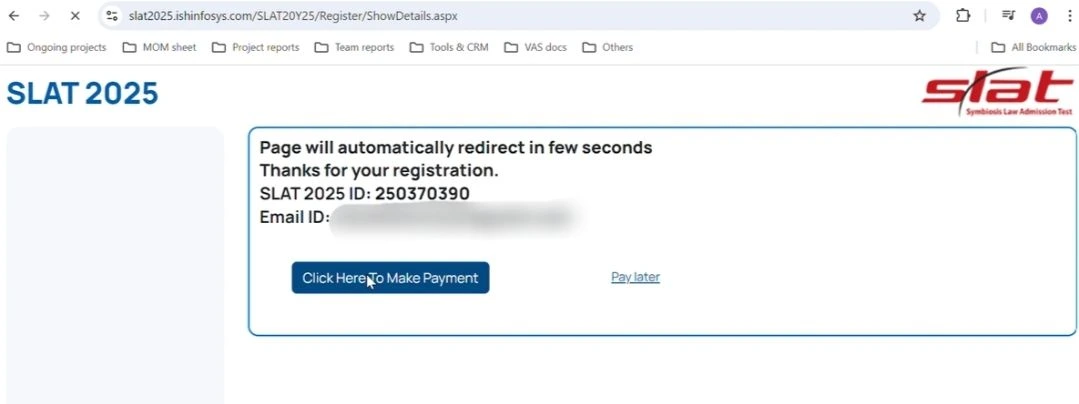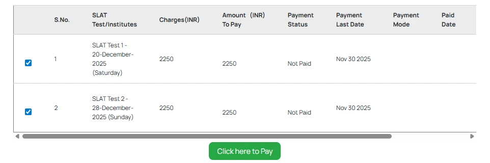 Pay the SLAT entrance test registration fee of INR 2250 per test (government taxes would be additional when applicable), which is non-transferable as per the instructions mentioned on the registration portal.